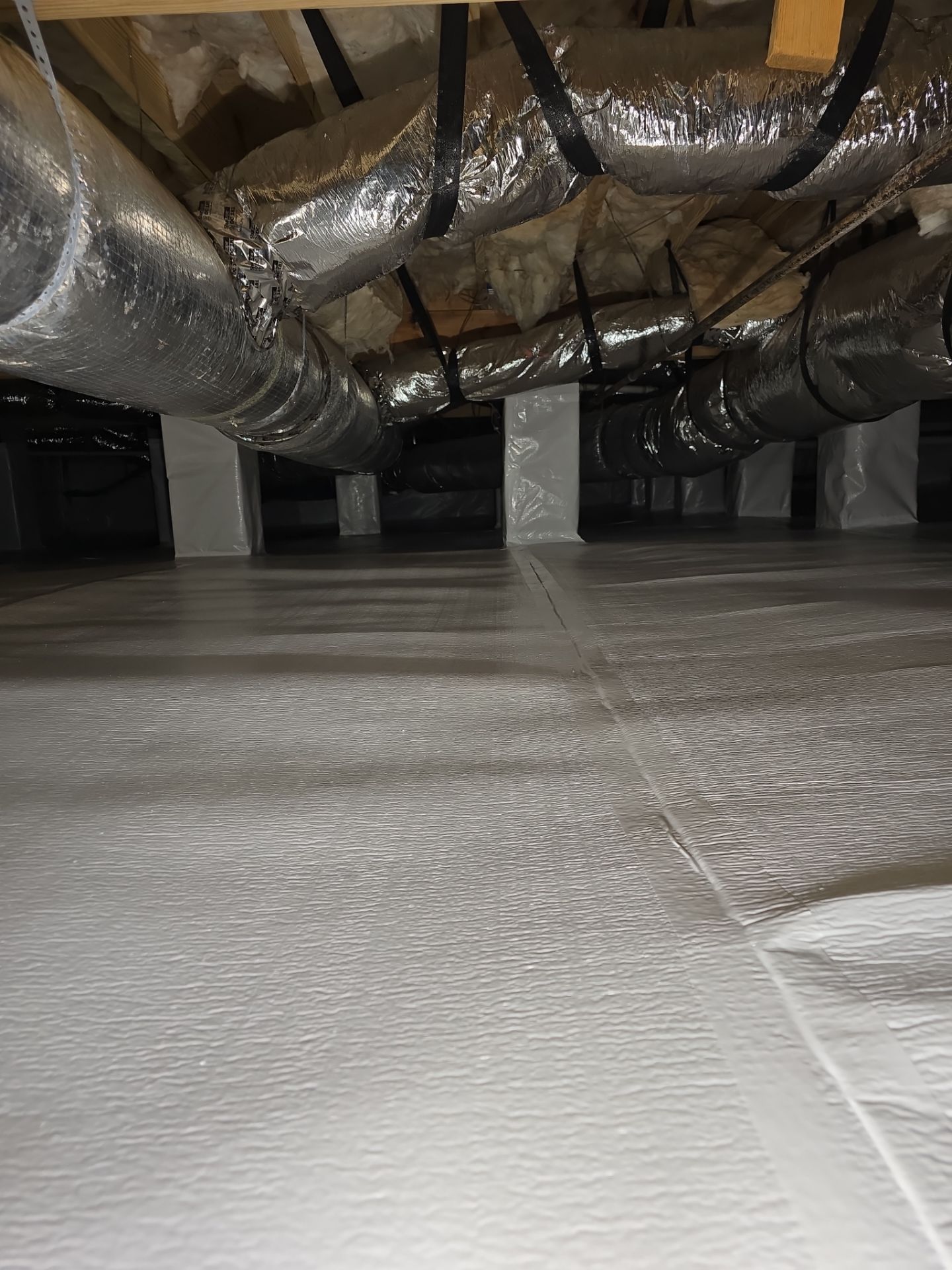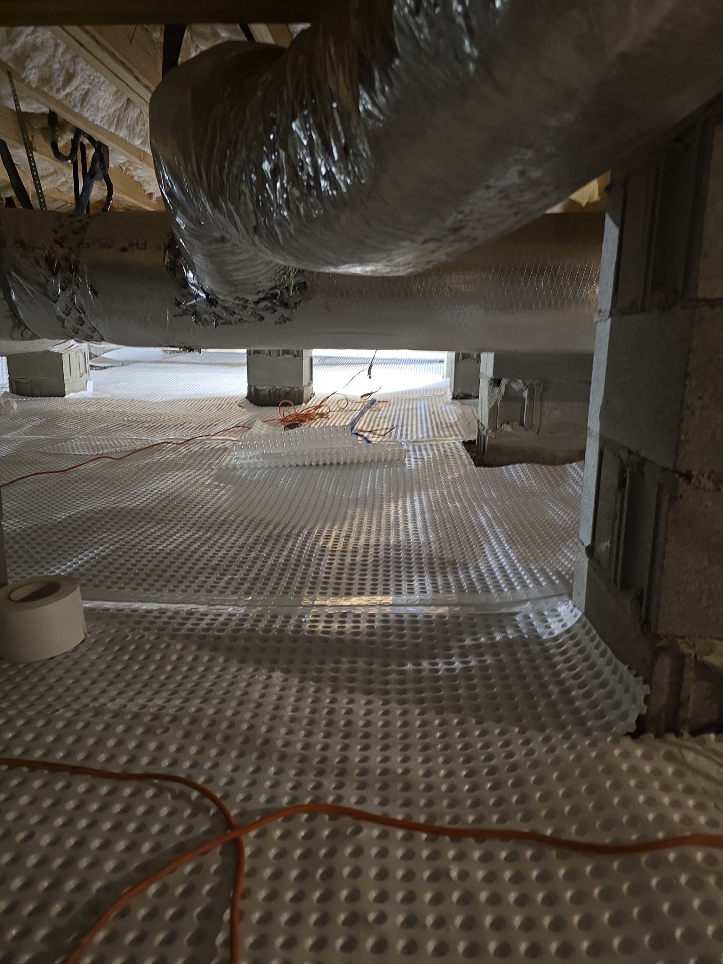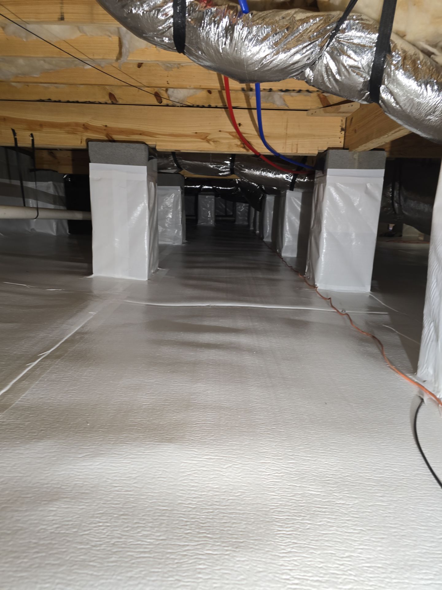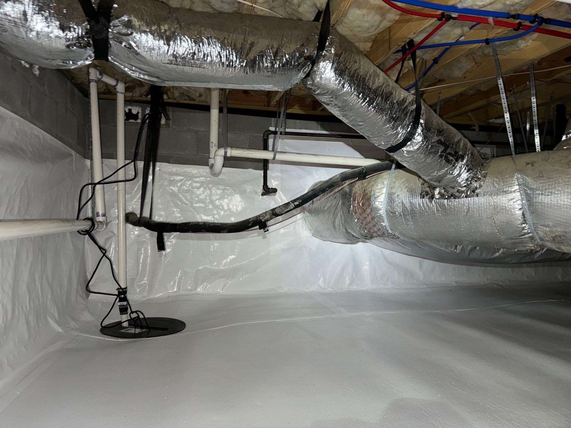 The system began with the installation of drainage (dimple) matting to promote water flow throughout the crawlspace. This matting directed water toward the lowest point of the crawlspace, where we installed a sump pump and basin to collect and safely discharge water away from the home. We then encapsulated the entire crawlspace with a heavy-duty 125-mil vapor barrier and added reflective insulation to improve energy efficiency. To further seal and protect the space, a new insulated crawlspace door was installed, preventing outside air and moisture from entering.