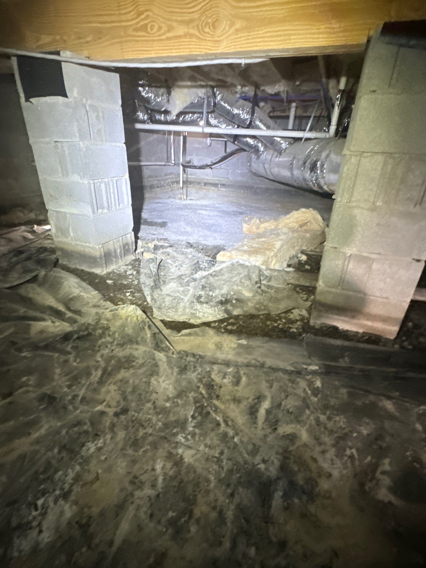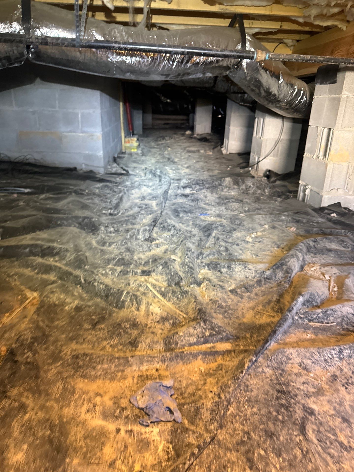 we recently completed a full crawlspace encapsulation project designed to eliminate standing water, control humidity, and provide long-term protection for the home. During our initial inspection, we found that the crawlspace was holding water and the existing vapor barrier was damaged, allowing moisture to penetrate and create unfavorable conditions. To address these concerns, we recommended and installed the Crawlspace Titans Moisture Management System, a comprehensive solution tailored to the unique challenges of this property.