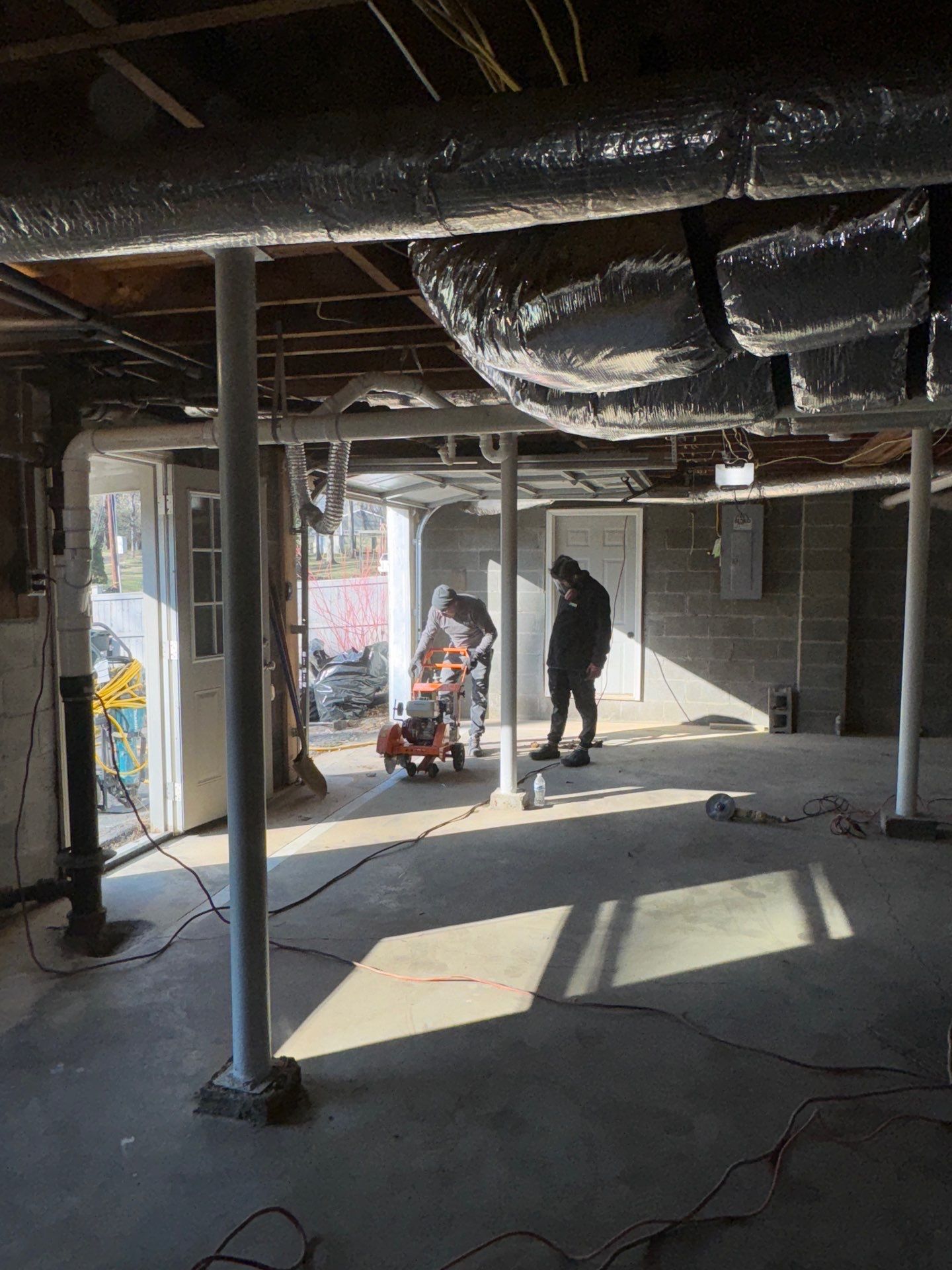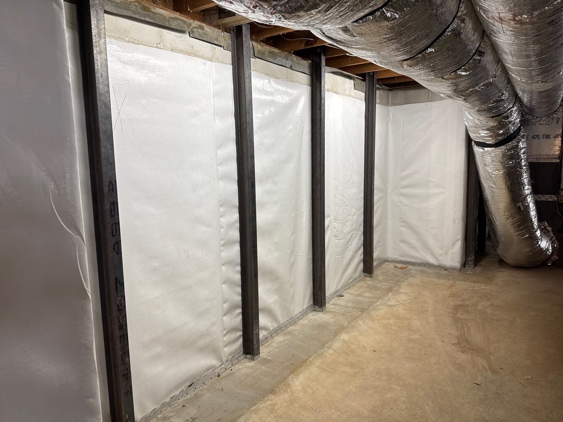 To resolve these issues, we installed a full perimeter moisture drainage system designed to capture and redirect water intrusion away from the foundation. This system was paired with a sump pump to ensure water collected was safely discharged away from the home, providing reliable protection against basement flooding. The drainage system not only addressed the moisture concerns but also helped to relieve the hydrostatic pressure contributing to the wall movement. For added structural support and stability, we installed a series of steel beams to reinforce the foundation walls and prevent further bowing. Once the structural and water concerns were addressed, we installed a radon mitigation system to reduce radon gas levels to a safe range, ensuring the air quality in the home was healthy for the occupants.
