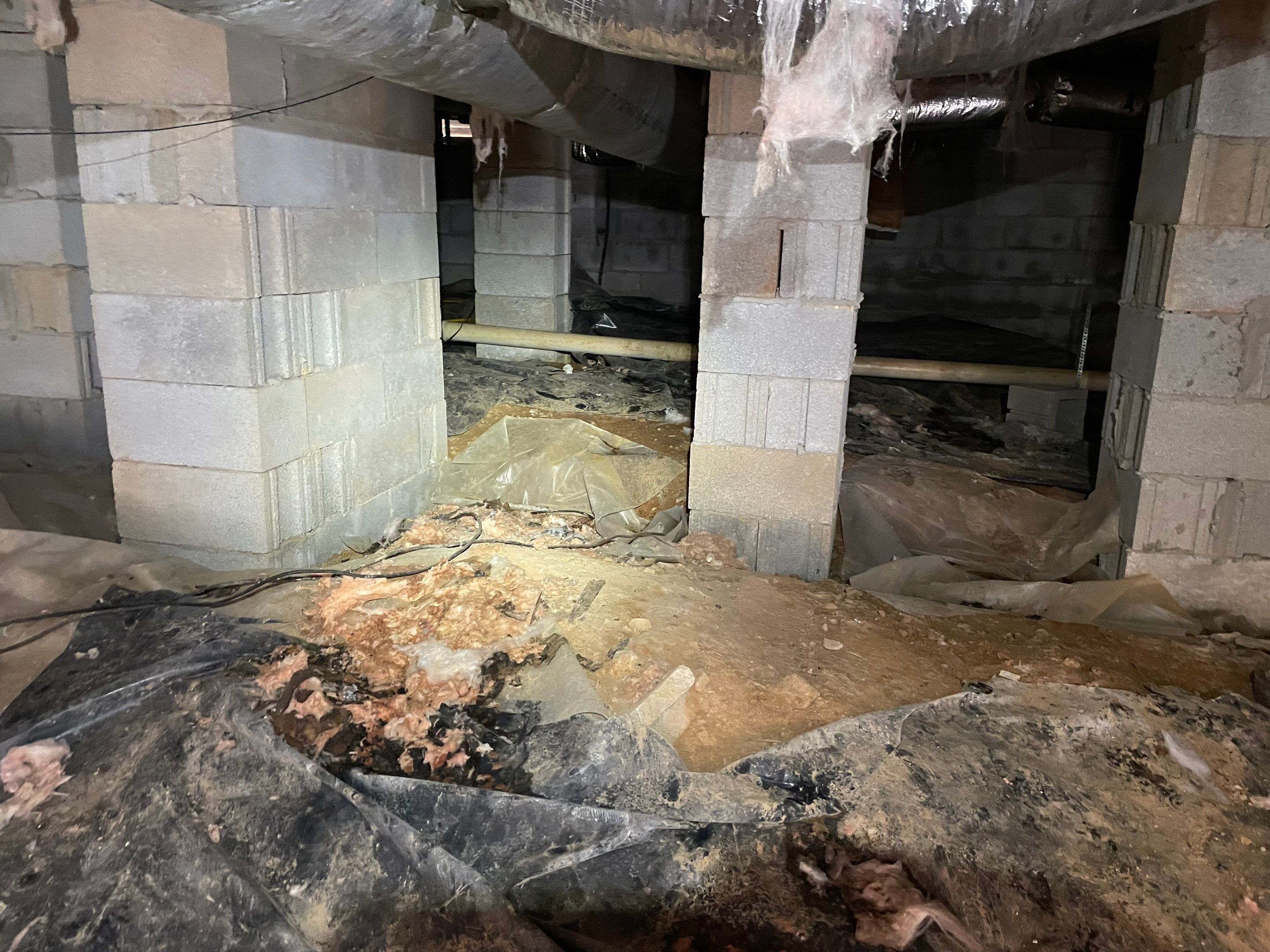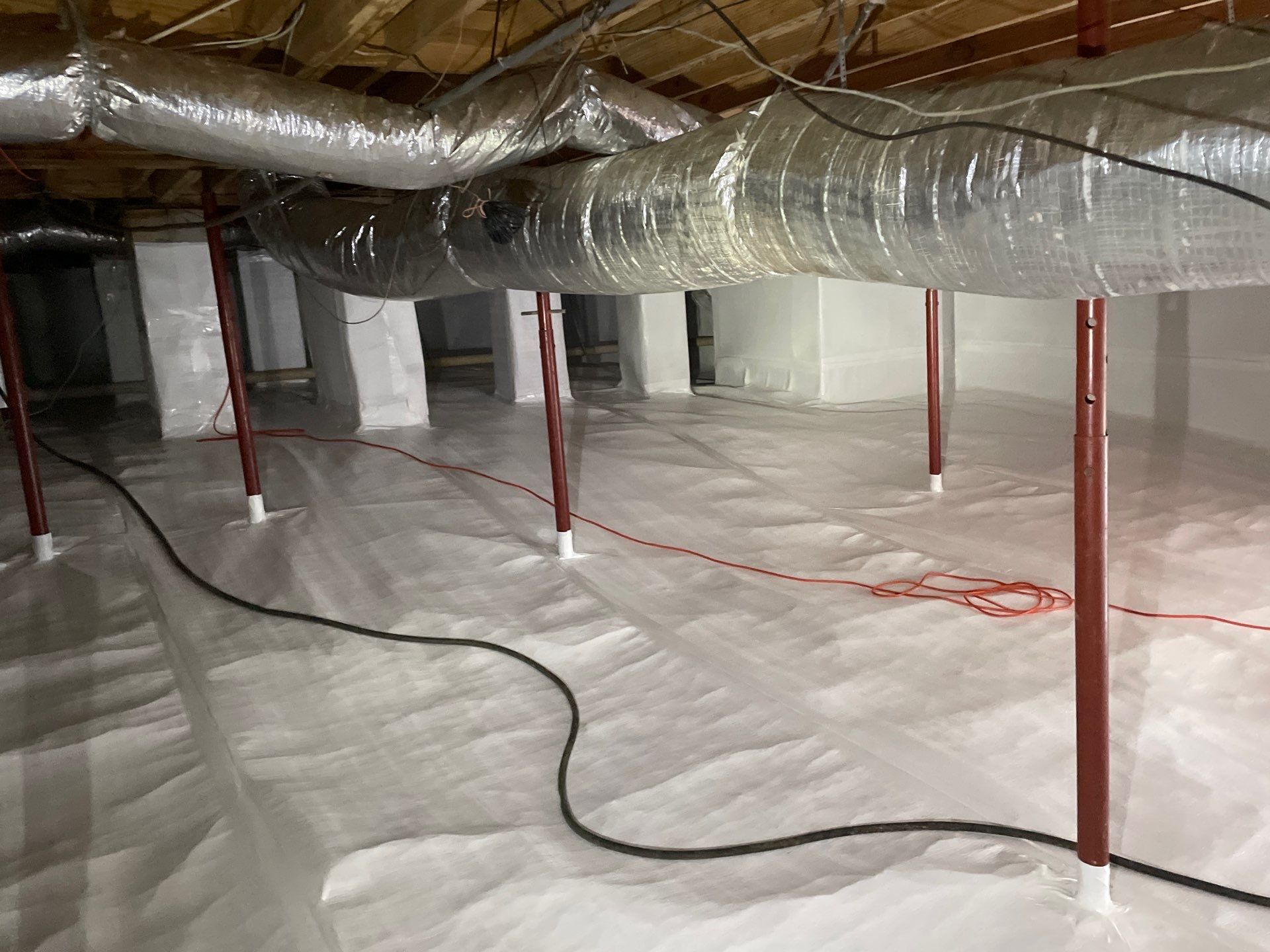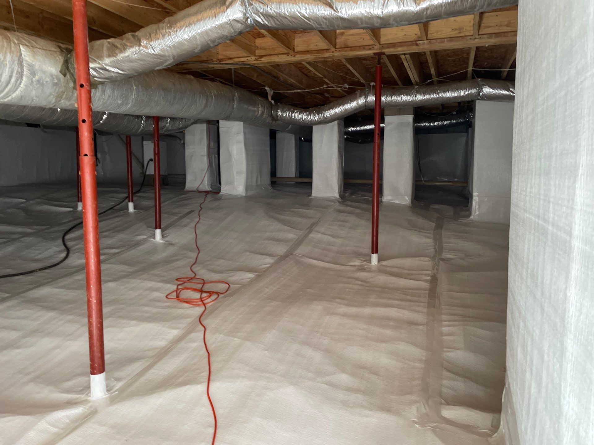 To address the concerns, our team removed all contaminated insulation to eliminate moisture-trapping materials and performed a full fungal treatment throughout the crawlspace. We installed a comprehensive perimeter drainage system designed to capture water and direct it safely to a sump pump, ensuring immediate removal of any standing water. Finally, the crawlspace was fully encapsulated with a durable 125-mil vapor barrier, creating a sealed environment to prevent future moisture intrusion.
