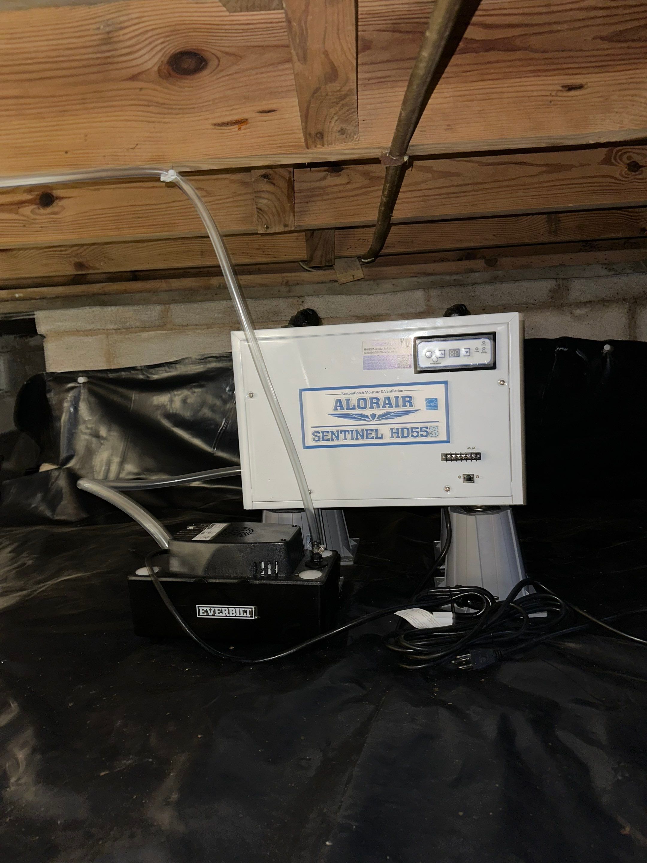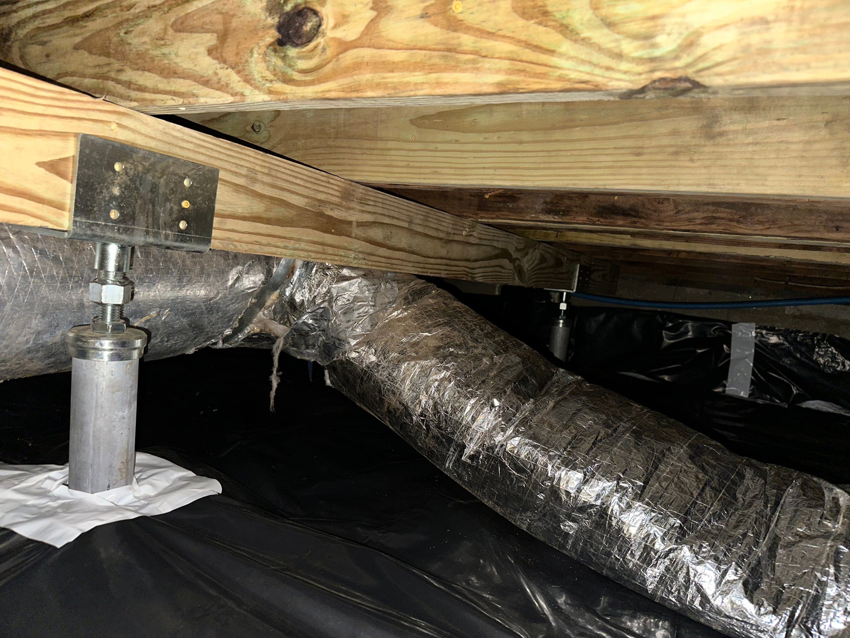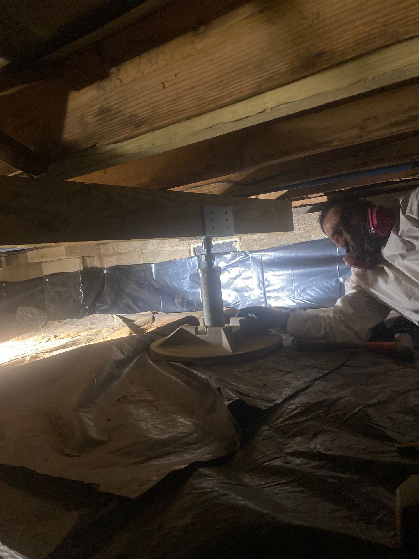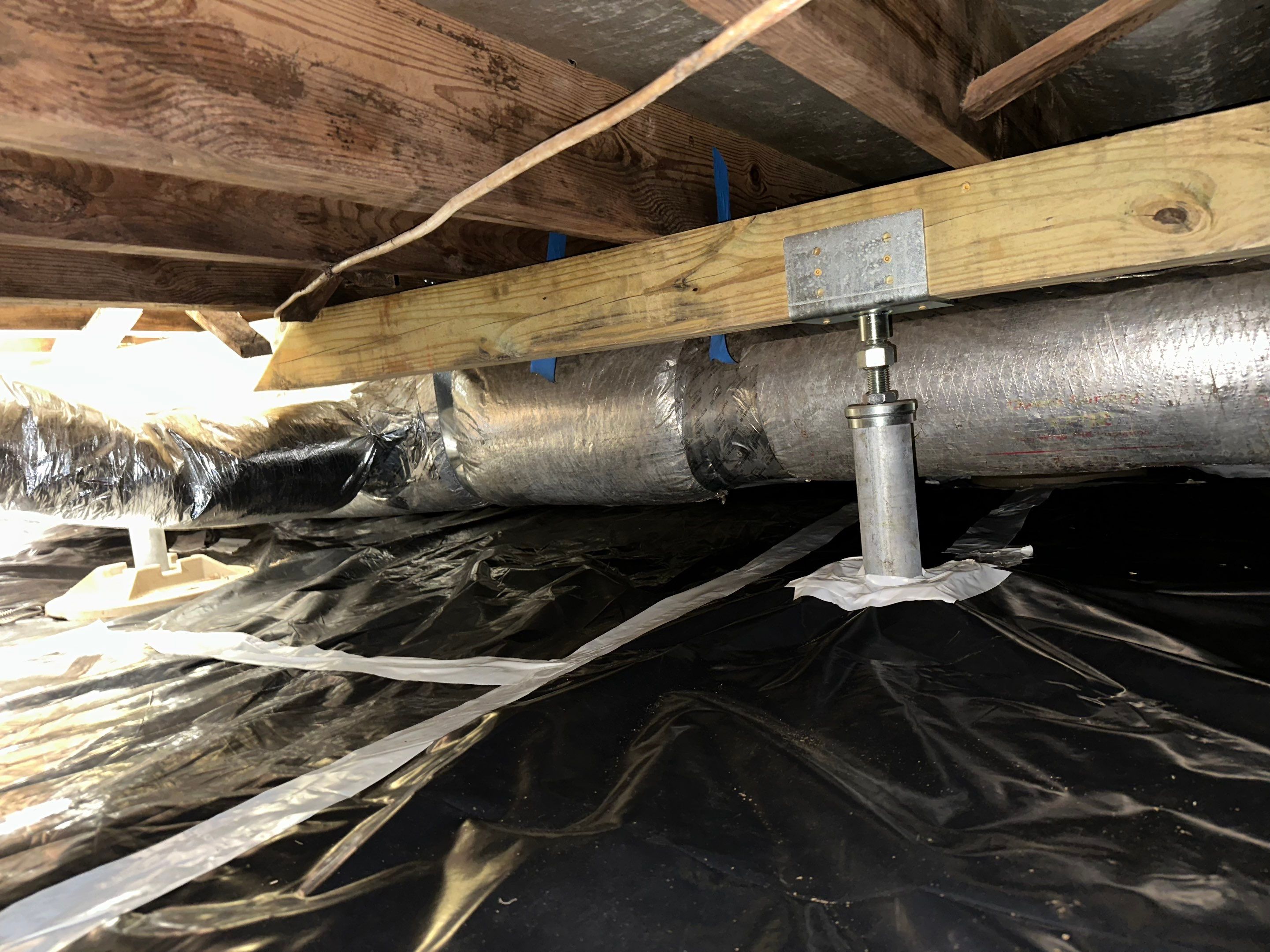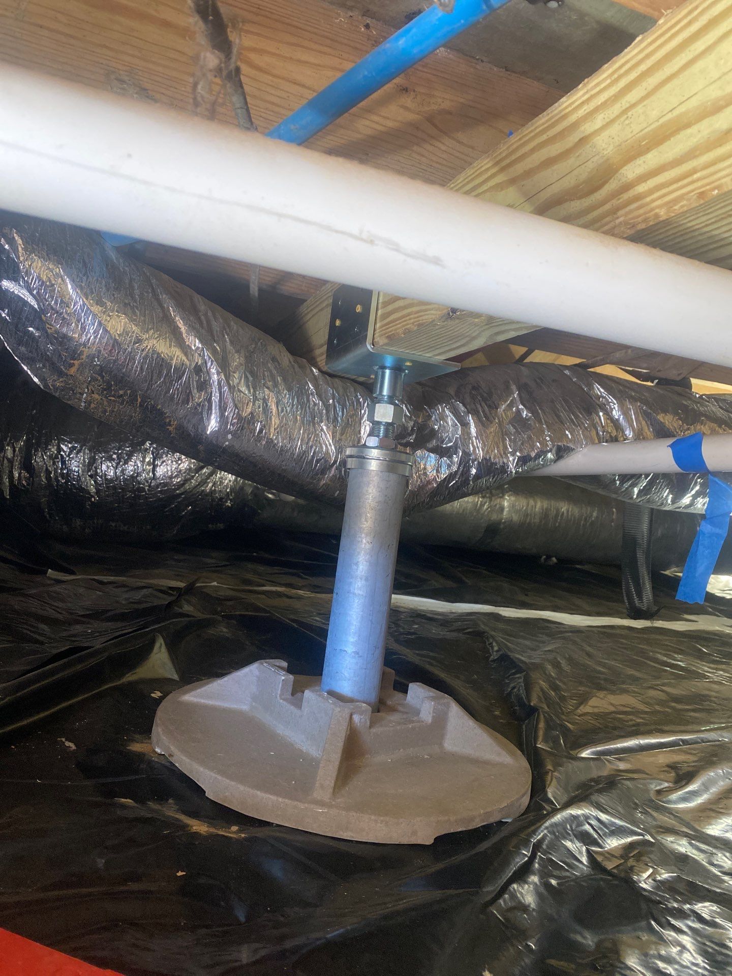 To further support the structure, we installed multiple power post stabilizers with poly-based engineered footers, which supported a newly installed support beam and reinforced the load-bearing capacity of the home. An affordable dehumidifier was also installed to maintain proper humidity levels and protect the crawlspace from future moisture-related issues. Finally, a simple 6-mil vapor barrier was installed to provide a basic moisture barrier and help maintain a drier environment.