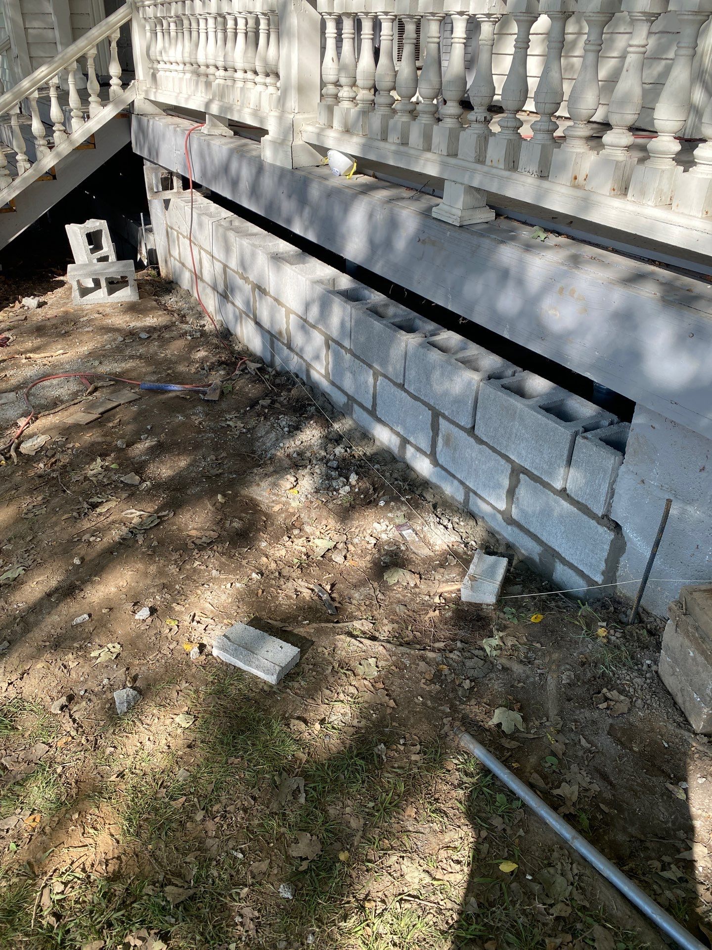 The project involved extensive foundation and deck support repairs to address structural issues caused by excessive water intrusion. The existing foundation wall around the deck was determined to be failing, which compromised the stability of the deck and the safety of the surrounding area. To address these concerns, the faulty foundation wall was carefully removed, and a new concrete footer was poured to provide a solid and permanent base for reconstruction. Following this, a CMU block foundation wall was rebuilt around the deck area, restoring structural integrity and ensuring long-term durability.