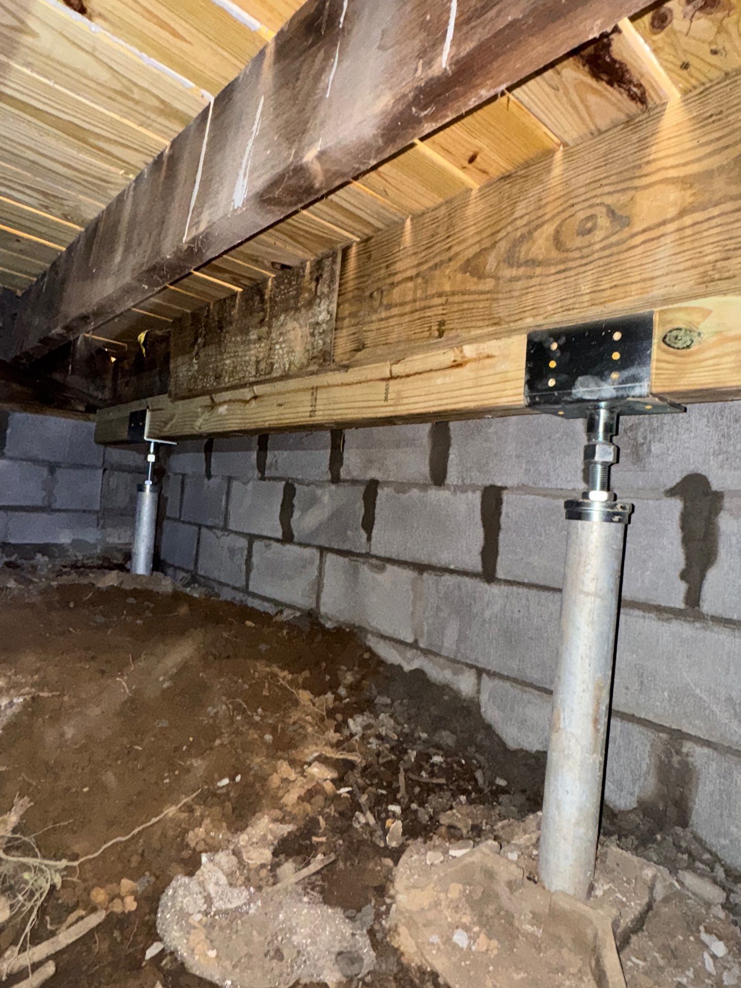 In addition to the foundation work, a Power Post stabilizer system was installed beneath the deck and affected floor areas. Each adjustable steel post was set on poly-based engineered footers, designed to evenly distribute weight and provide maximum support. This system reinforces weakened structural areas and prevents future settling, ensuring the deck and surrounding flooring remain stable over time.