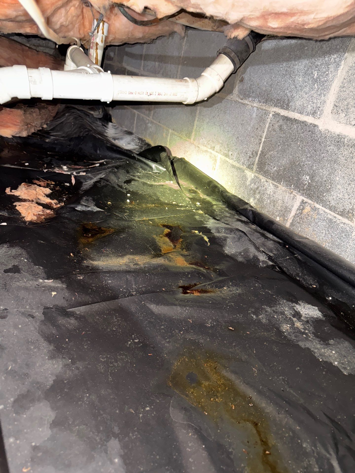 During our inspection, we discovered areas of fungal growth, damaged vapor barriers, animal feces, and elevated humidity levels throughout the basement and three separate crawlspace sections. Our team recommended removing all contaminated materials and debris, followed by a thorough cleaning and disinfecting of the affected areas.