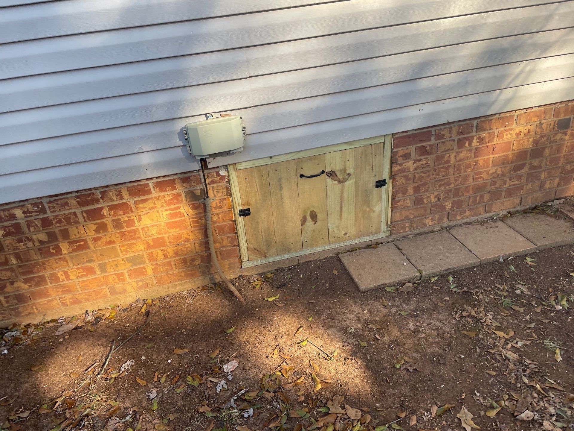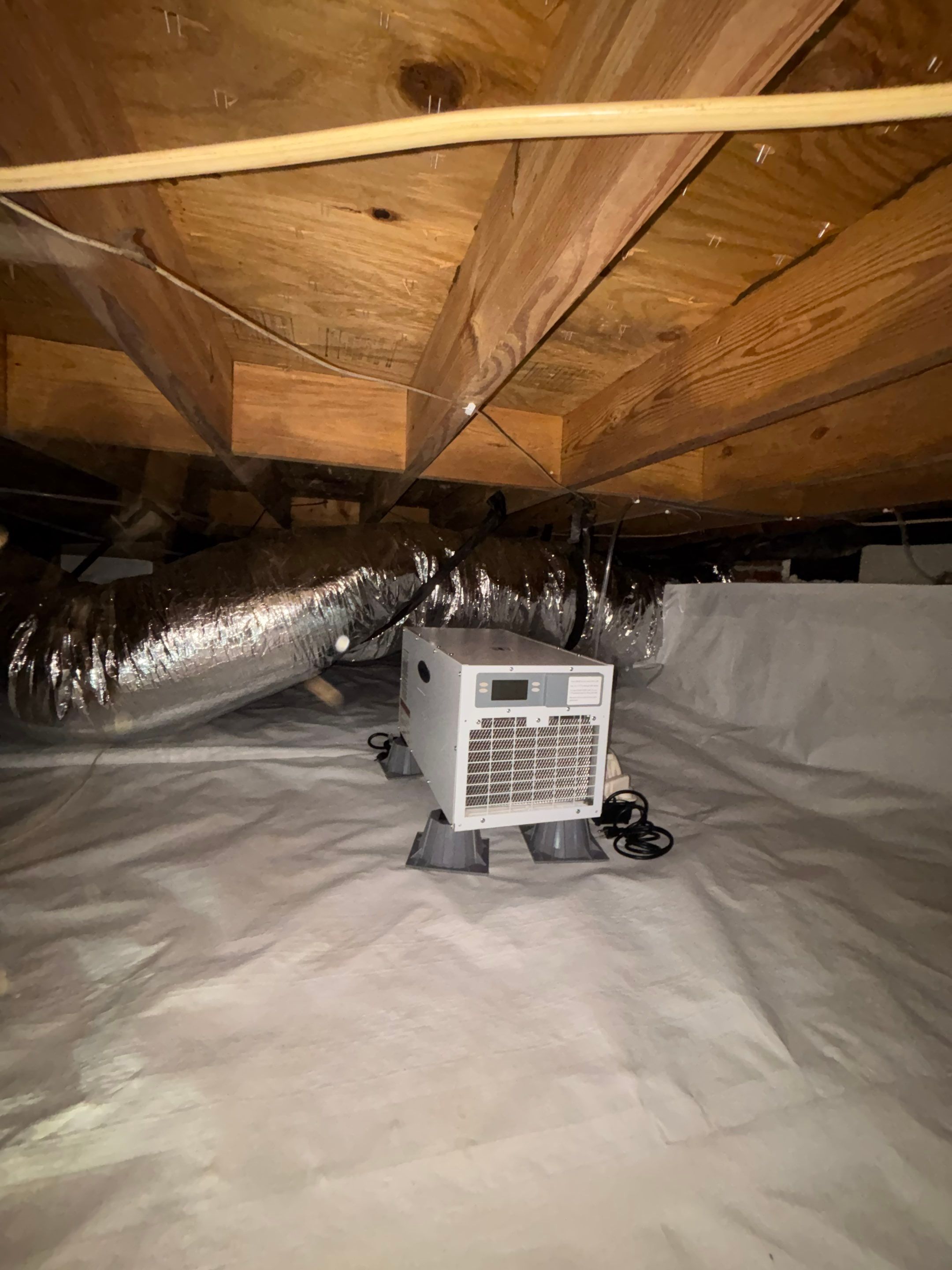 Due to unique exterior drainage challenges, a trench drain was installed across the driveway to safely collect and discharge water farther from the foundation. As part of the encapsulation system, we installed a professional grade dehumidifier to maintain consistent humidity levels and help prevent future fungal growth. All crawlspace vents were sealed from the interior, and a new insulated crawlspace door was installed prior to the final encapsulation. Before completing the project, the entire crawlspace was treated using our two-step chemical disinfecting process to remove and neutralize existing fungal growth.