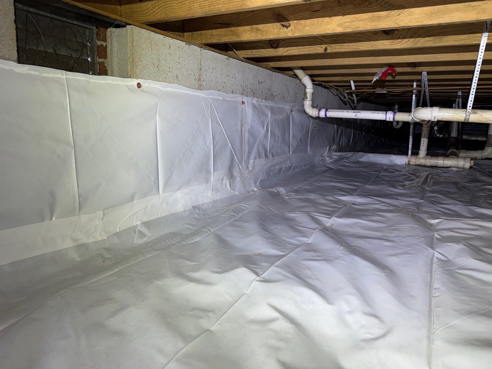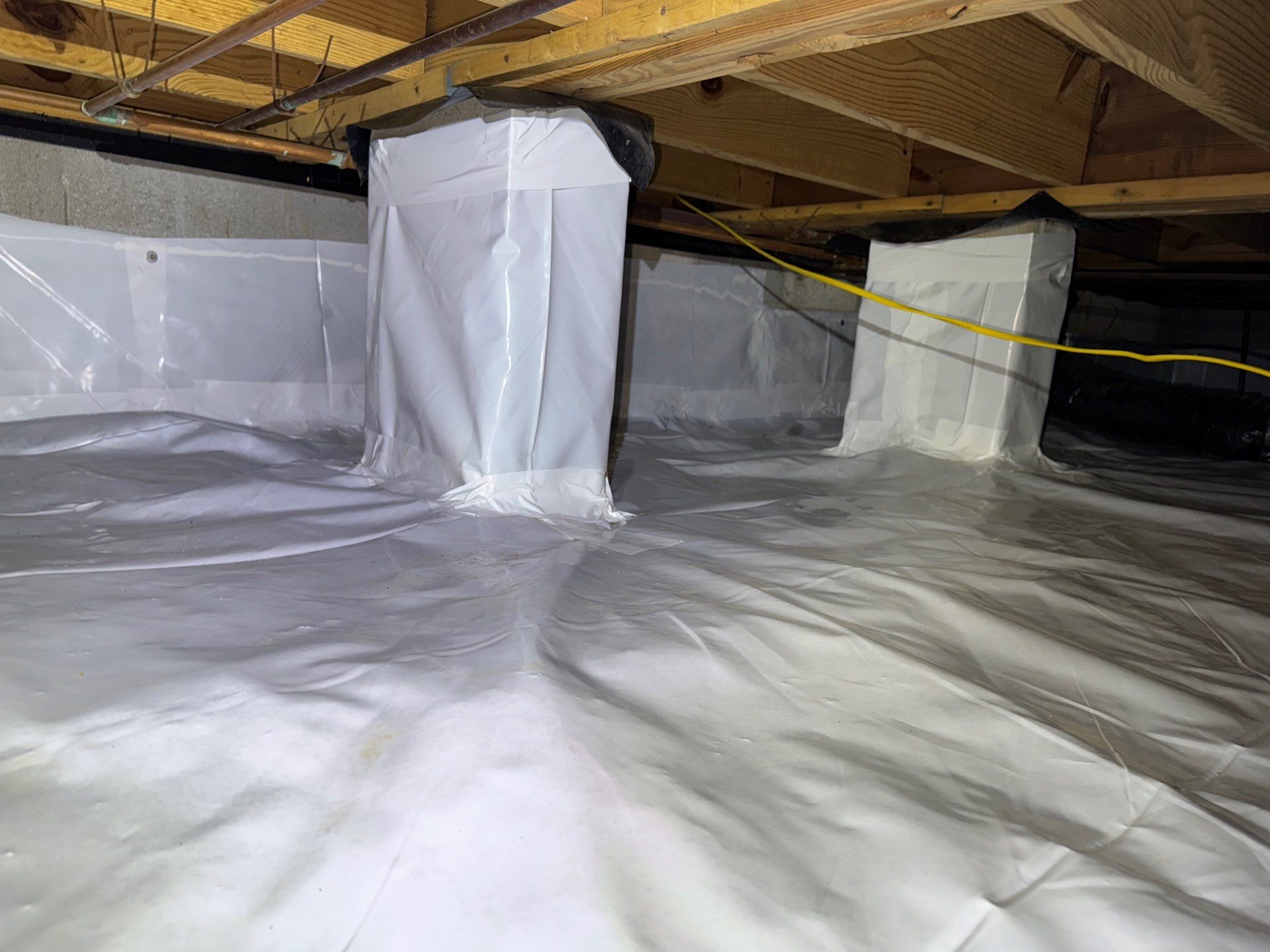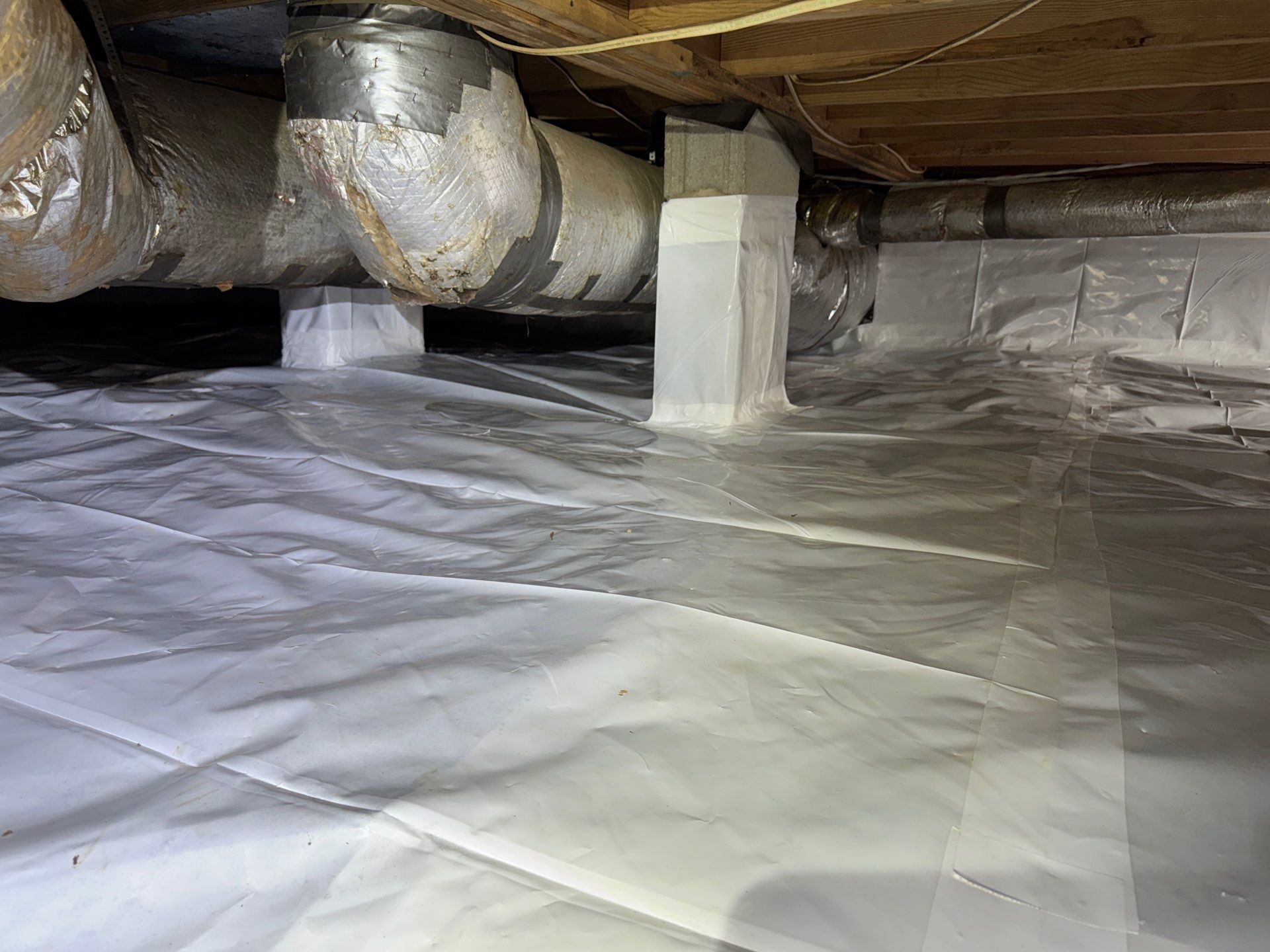 Our crew efficiently transformed the crawlspace by performing a full fungal cleaning, removing all debris, and installing a new white vapor barrier. The vapor barrier was extended up the walls and around the support pillars as part of a partial encapsulation, providing added protection against ground moisture and vapor intrusion. The result is a cleaner, healthier crawlspace and improved long-term protection for the home.