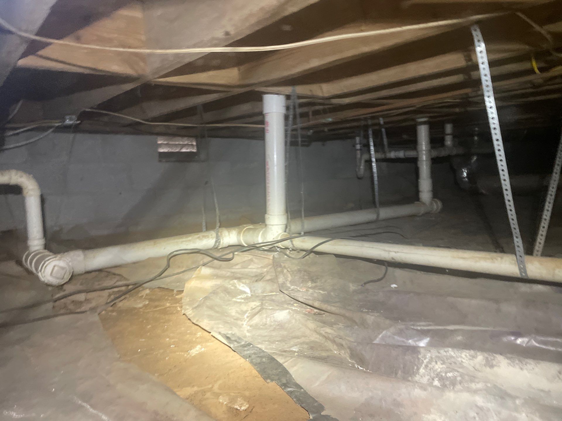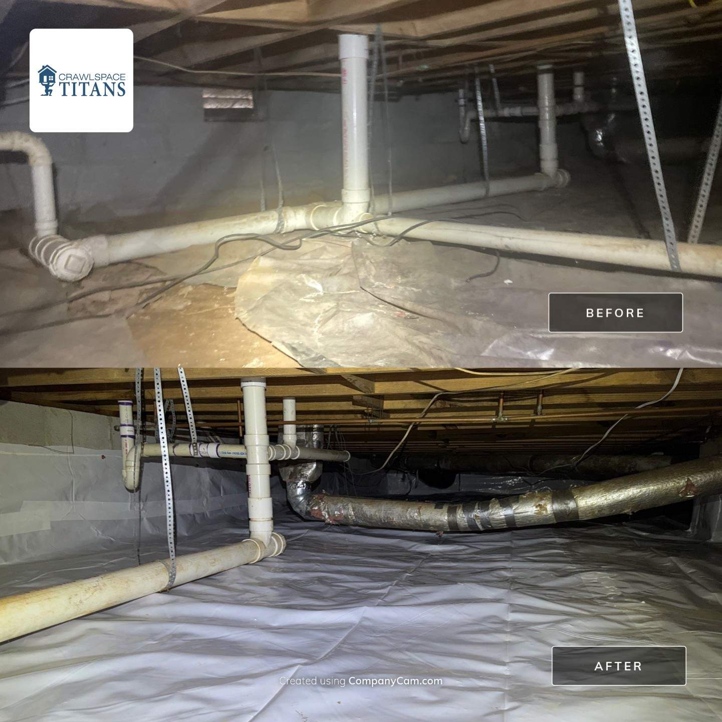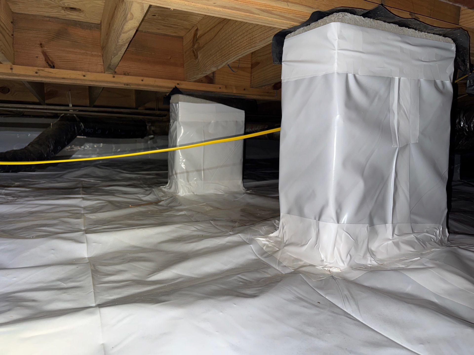 Our crew efficiently transformed the crawlspace by performing a full fungal cleaning, removing all debris, and installing a new white vapor barrier. The vapor barrier was extended up the walls and around the support pillars as part of a partial encapsulation, providing added protection against ground moisture and vapor intrusion. The result is a cleaner, healthier crawlspace and improved long-term protection for the home.