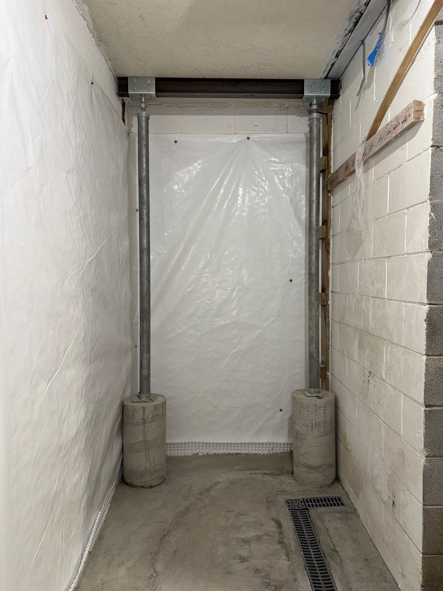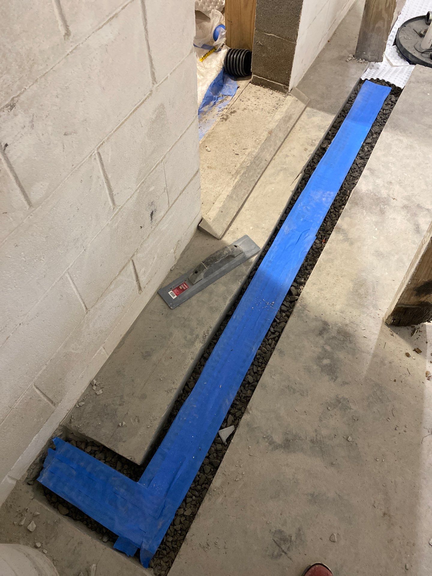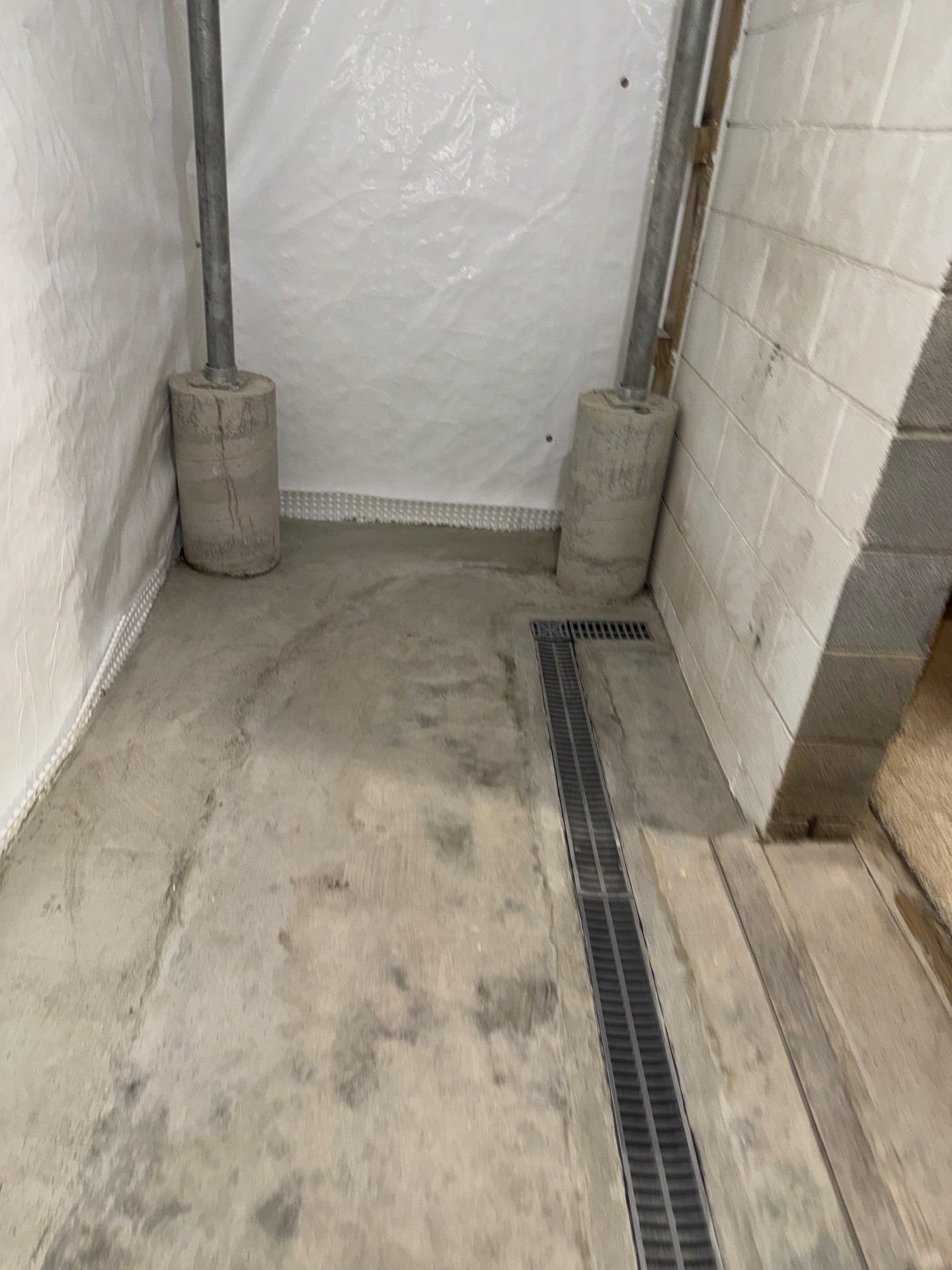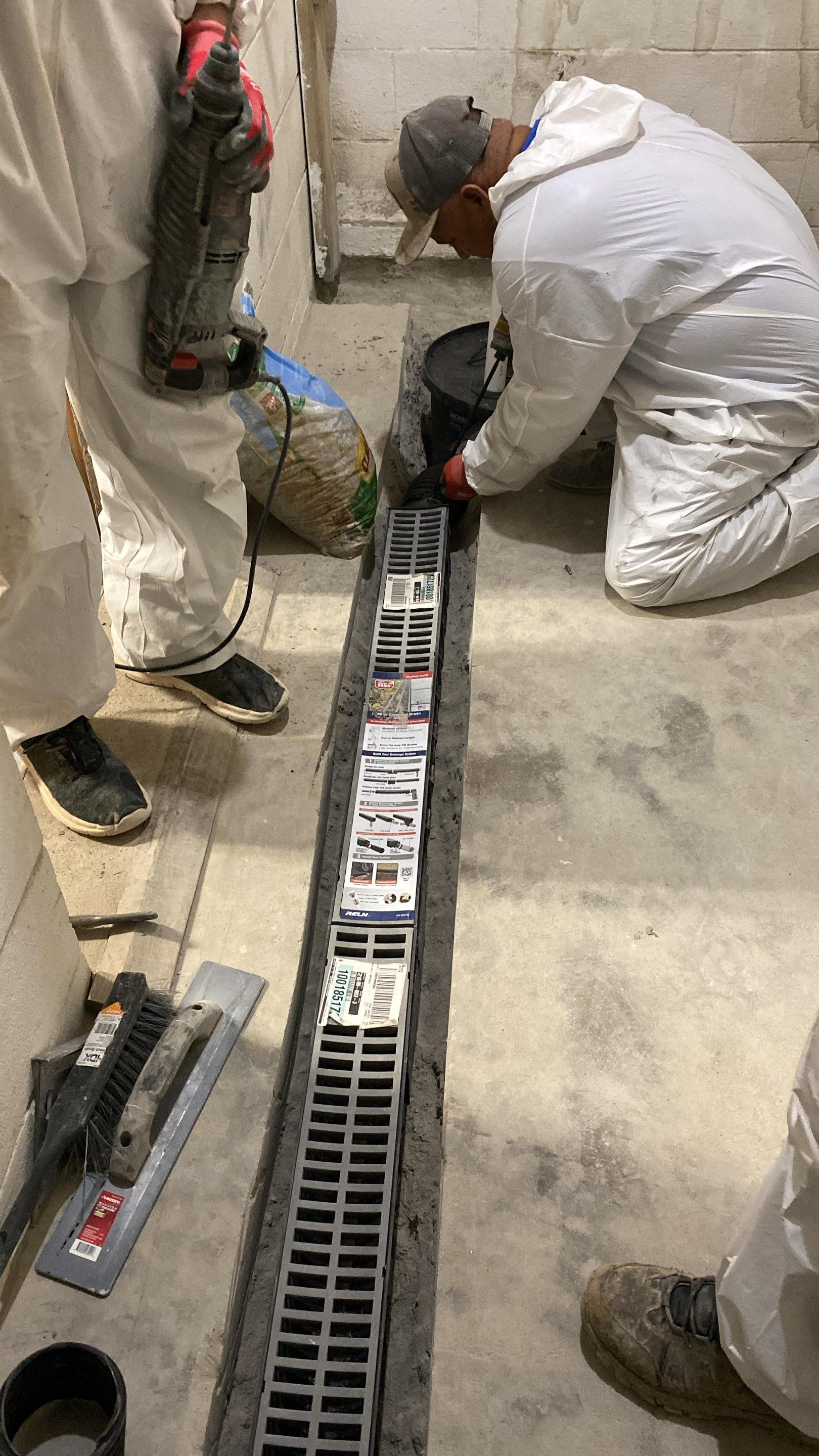 To manage any future groundwater intrusion, we installed an interior basement drain system along the affected foundation wall to collect water at the point of entry. A wall moisture barrier was added to direct seepage into the drainage system rather than allowing it to enter the living space. Additionally, we installed a trench drain to capture any water coming from overhead areas.