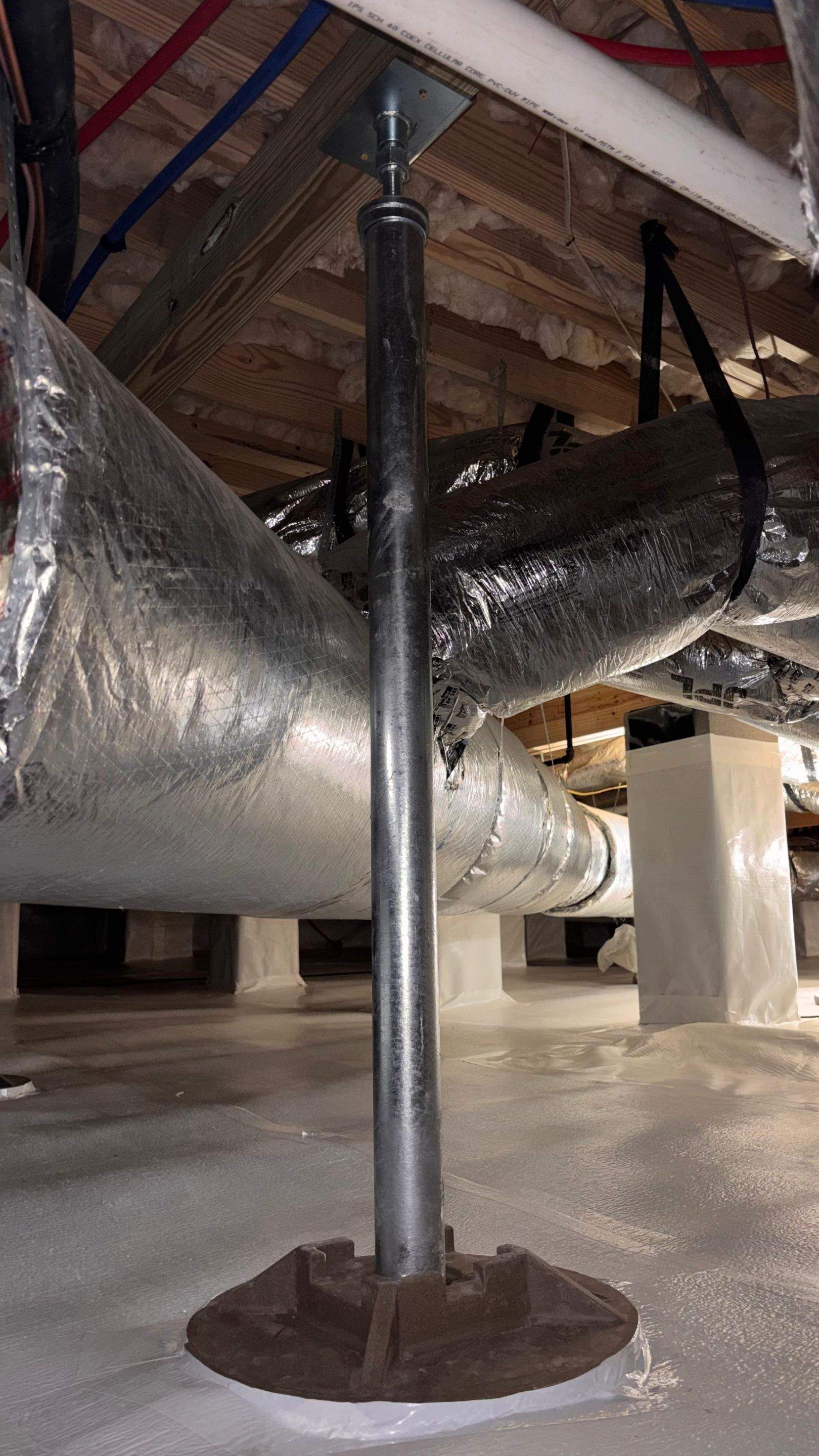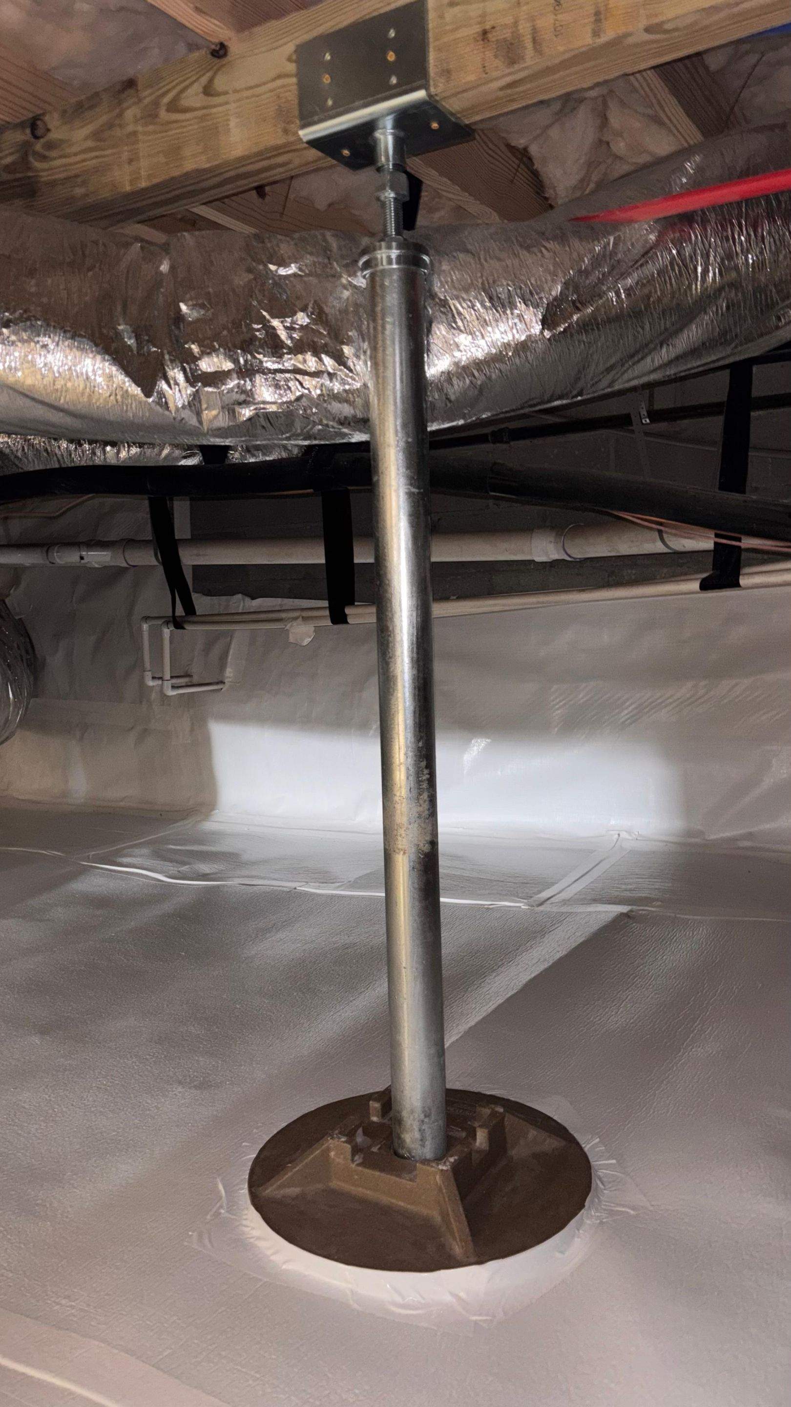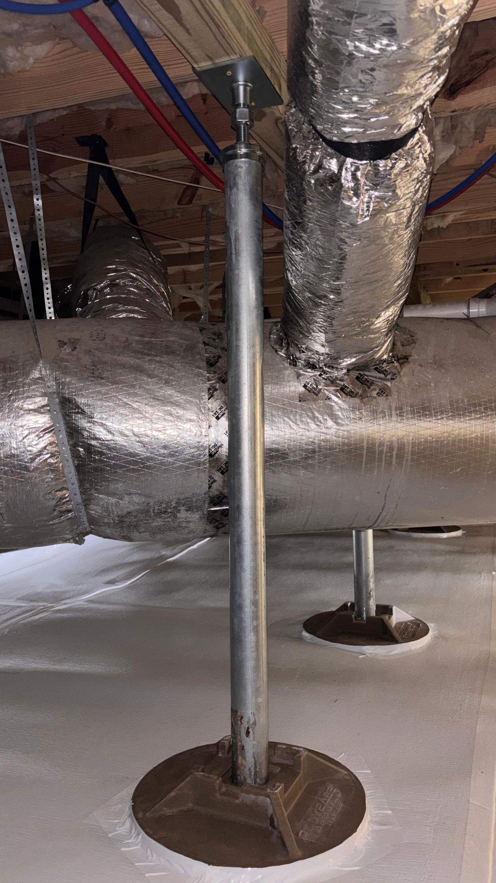 To permanently correct the issue, we installed a reinforced beam system supported by adjustable Power Post supports. This solution stabilized the structure and restored proper support to the affected area.