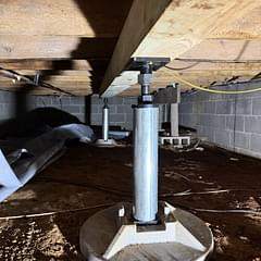 In addition to the moisture issues, the flooring system in this older home required additional structural support. While some support had been installed previously, it was improperly installed and insufficient to properly stabilize the floor system. Our team installed a professionally engineered power post and beam support system to reinforce the structure and help stabilize and lift sections of the flooring.