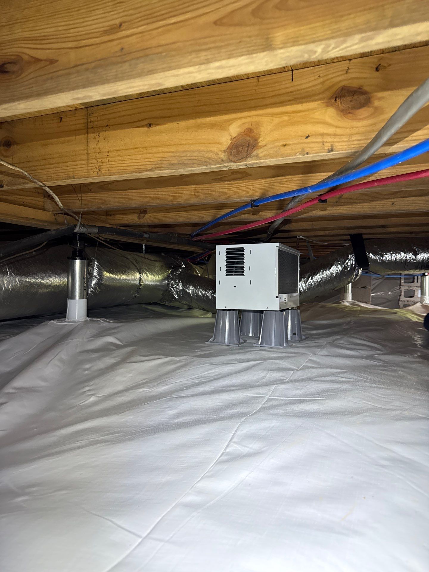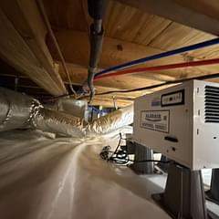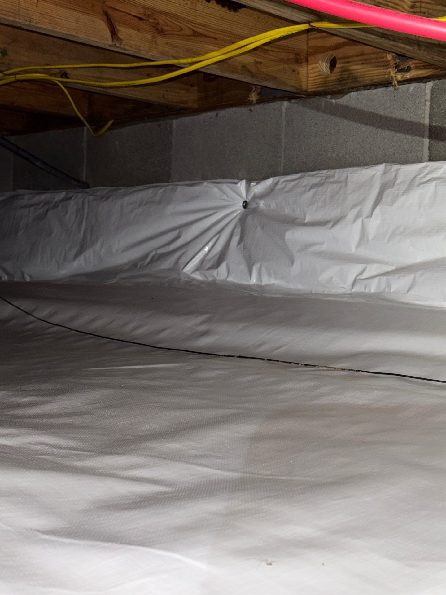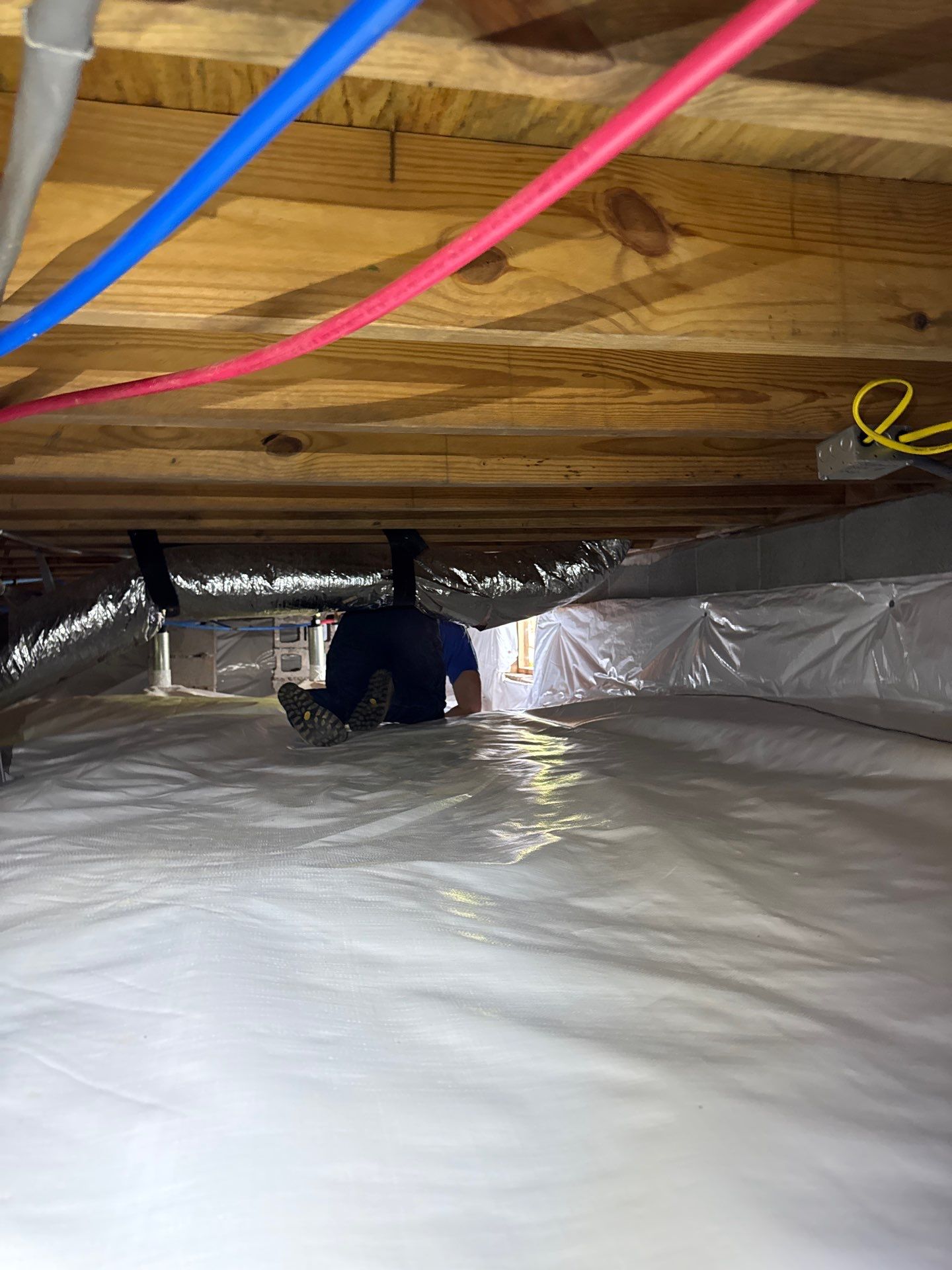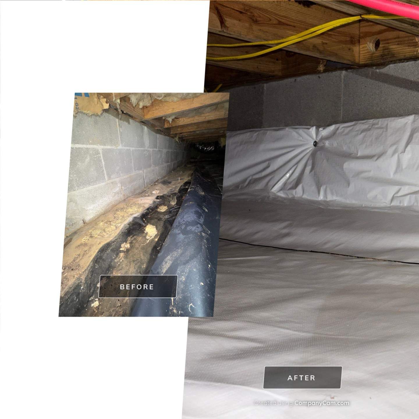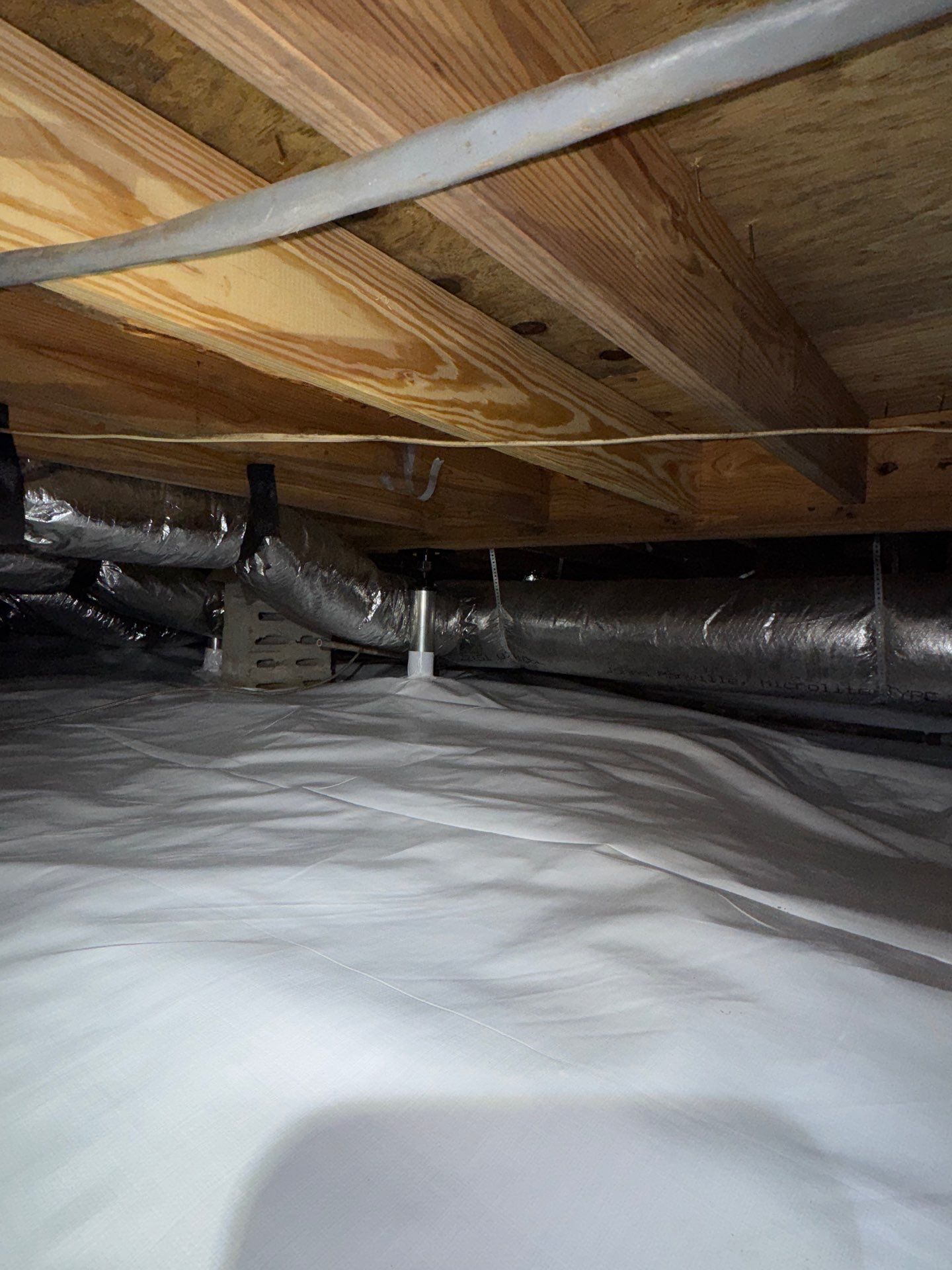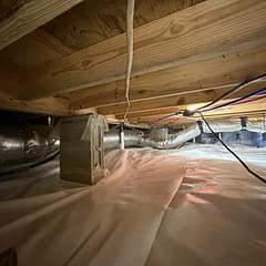 Next, we installed a complete crawlspace encapsulation system. This included adding new insulation along the crawlspace walls to create a more effective thermal envelope, helping regulate indoor temperatures and improve energy efficiency. Encapsulation also provides a durable vapor barrier, significantly reducing moisture intrusion and protecting the home from humidity-related damage.