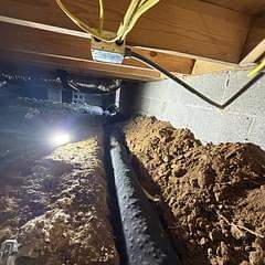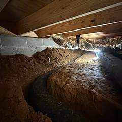 To address the water issues, we implemented an interior drainage system designed to capture and redirect groundwater. This system channels water to a newly installed sump pump located at the lowest point of the crawlspace, ensuring that any future water intrusion is efficiently managed. In addition, we made necessary exterior drainage corrections to further direct water away from the foundation, reducing the risk of recurring problems.