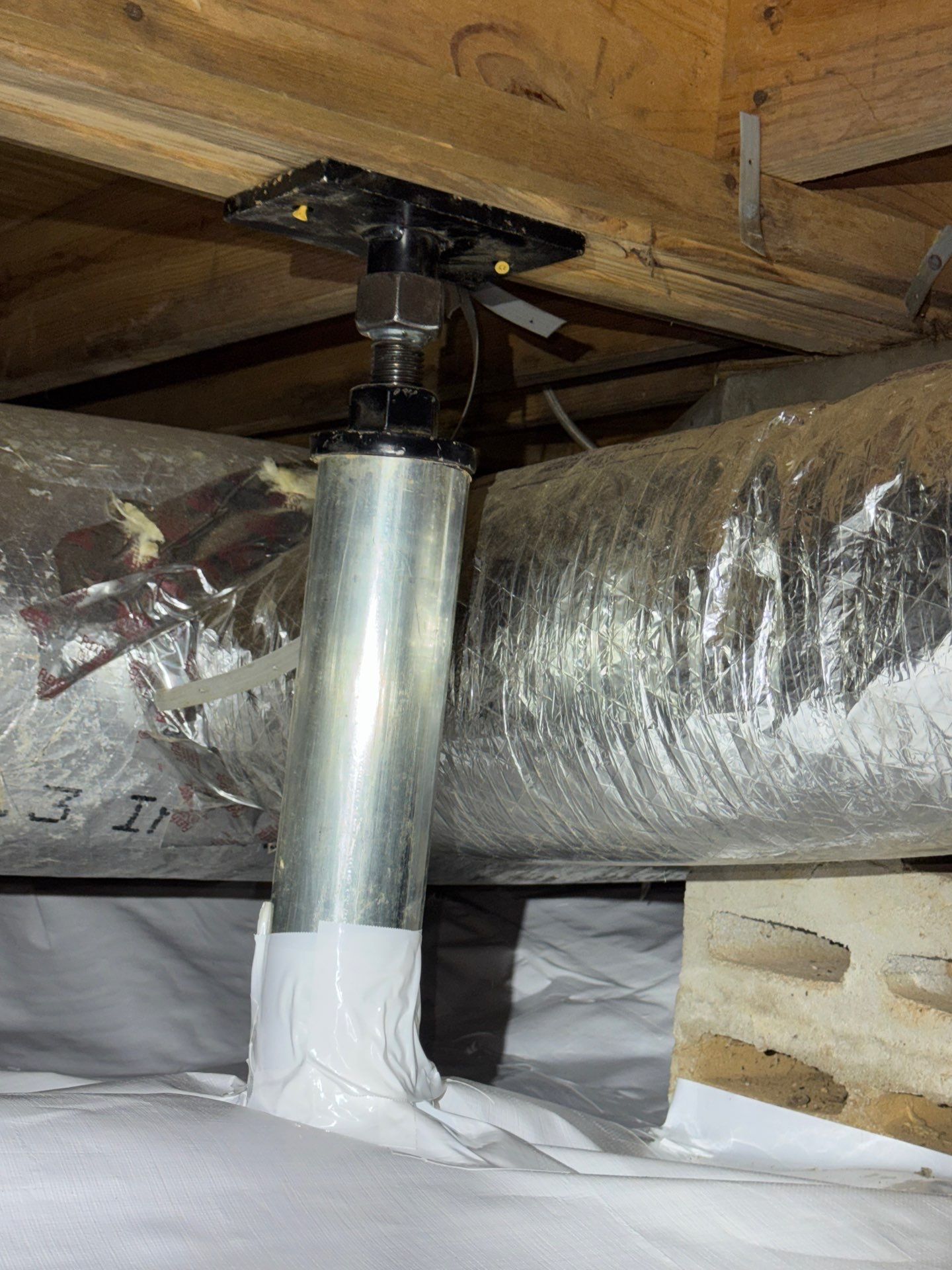 Structural stability was another major focus of this project. The existing support piers were inadequate, so we installed reinforced power posts with poly-based engineered footers to properly support the home’s load. This upgrade provides long-term stability and helps prevent sagging floors or structural shifting over time.