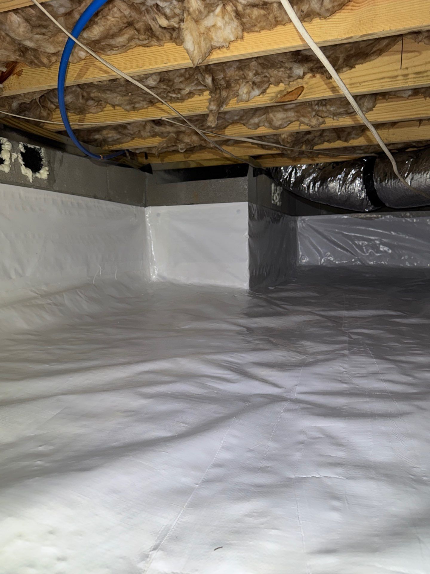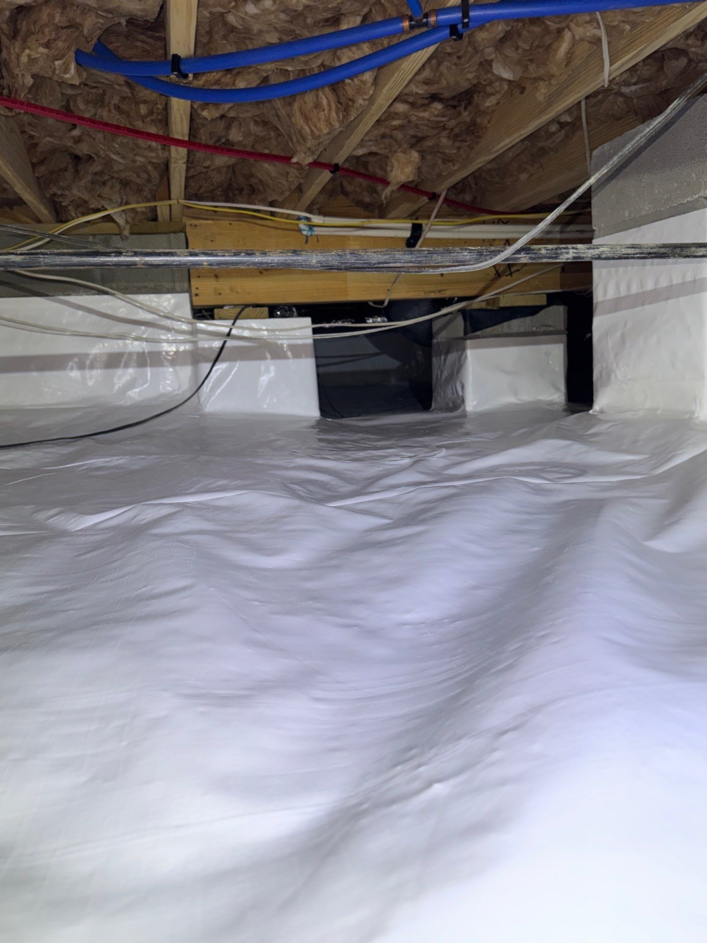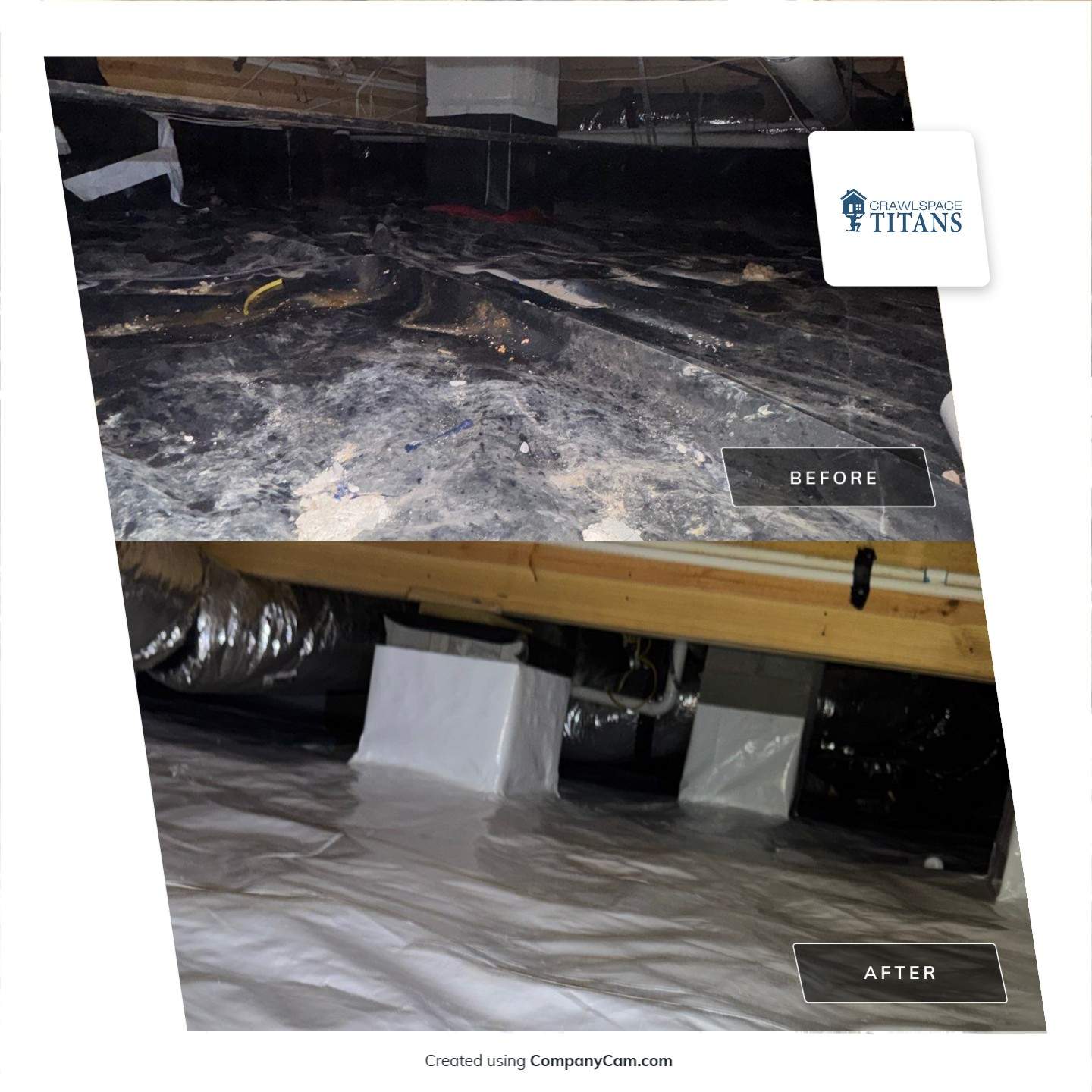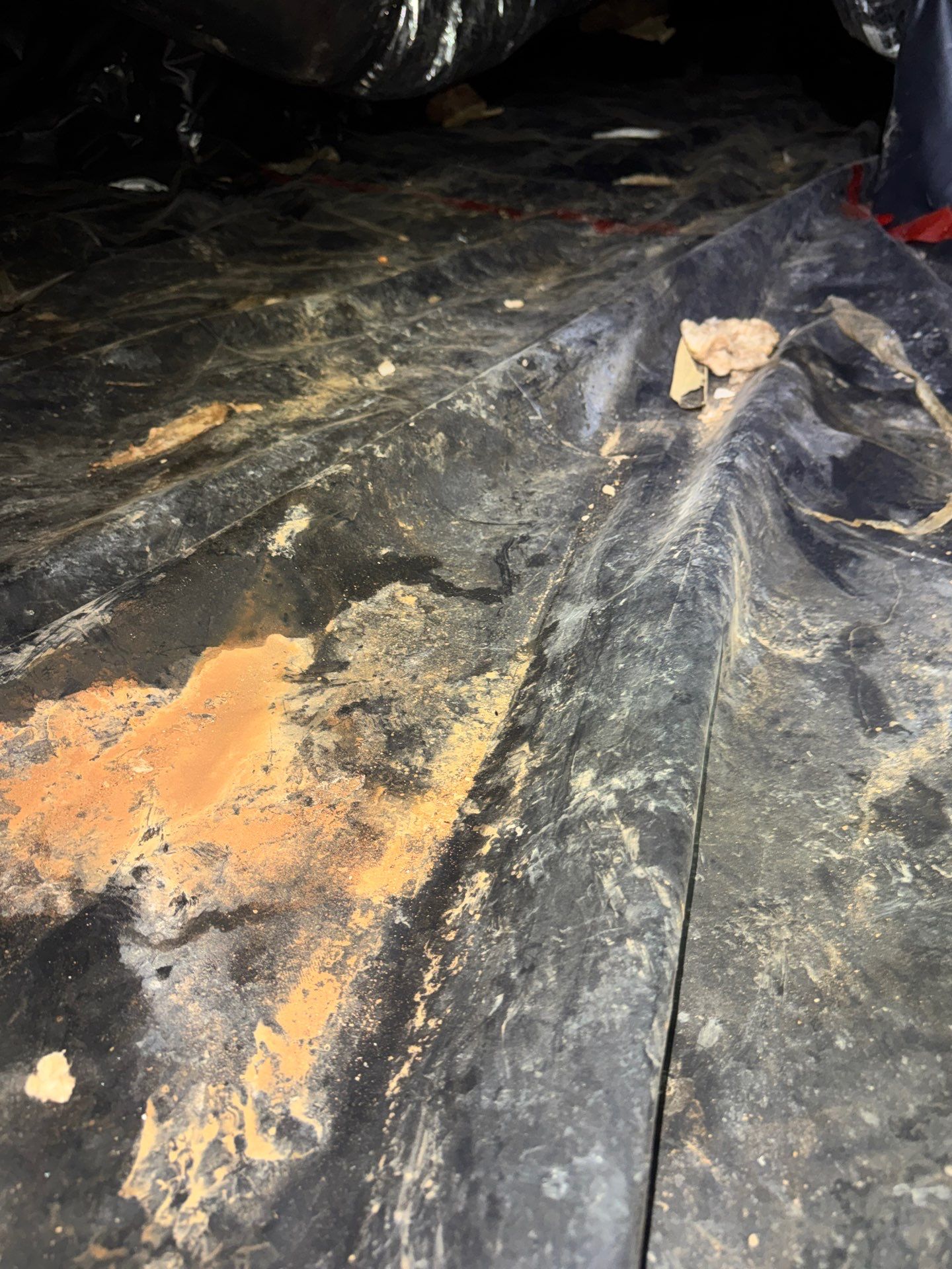 To restore the crawlspace, we began by removing the damaged vapor barrier, which showed signs of wear including holes, sagging sections, and water contamination. We also cleared out all compromised and contaminated debris to create a clean, stable foundation for repairs. From there, we installed a high-quality encapsulation system designed to properly seal and protect the crawlspace environment.