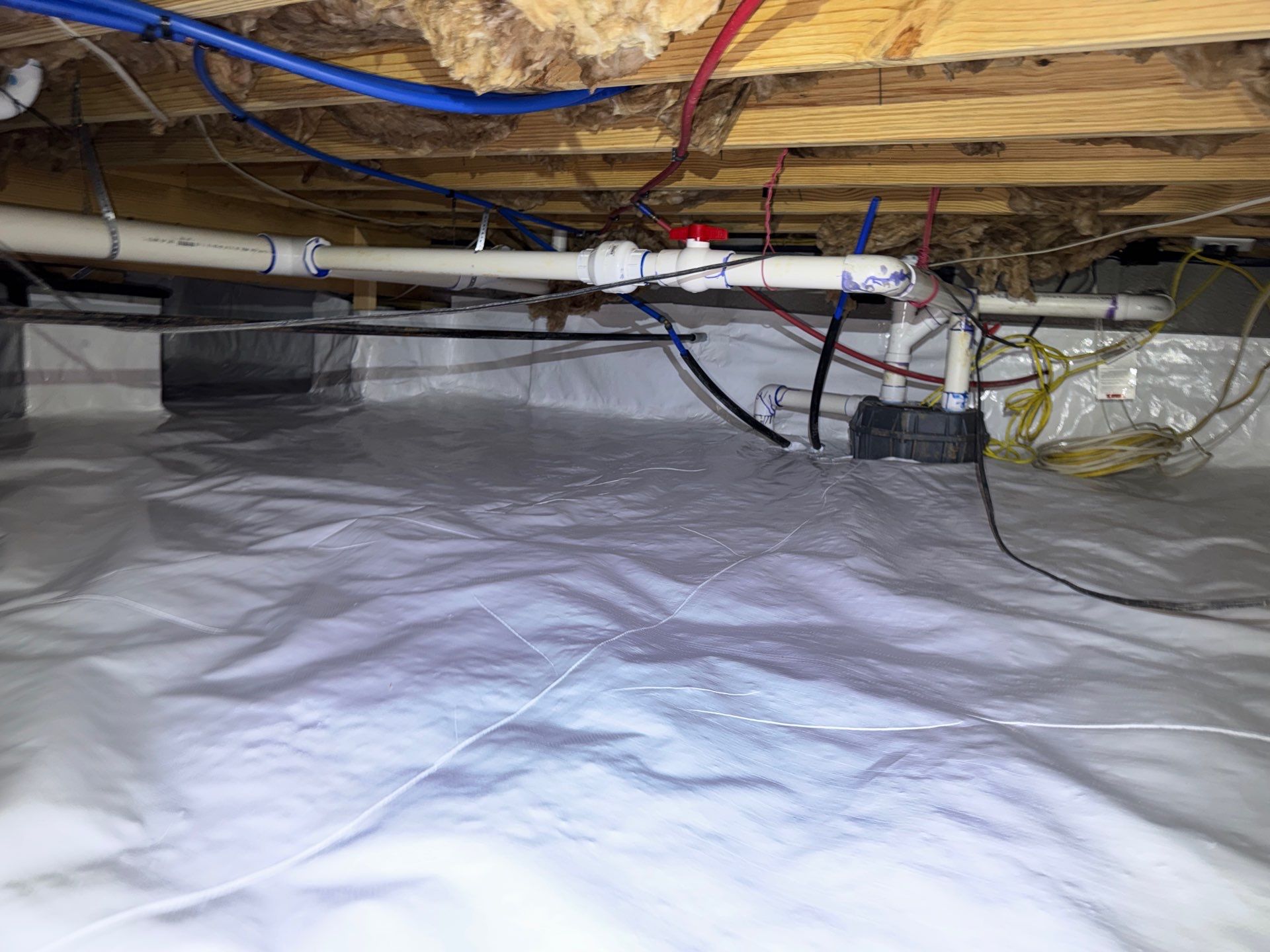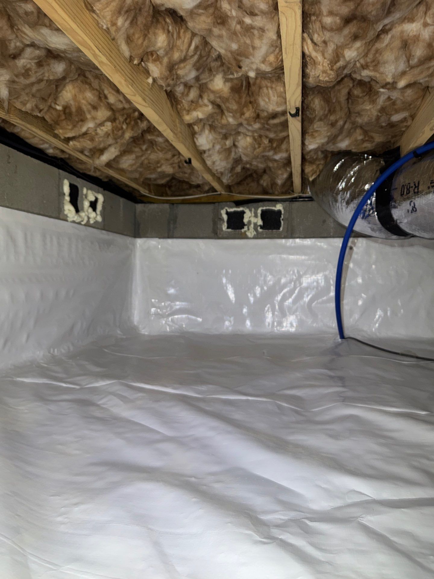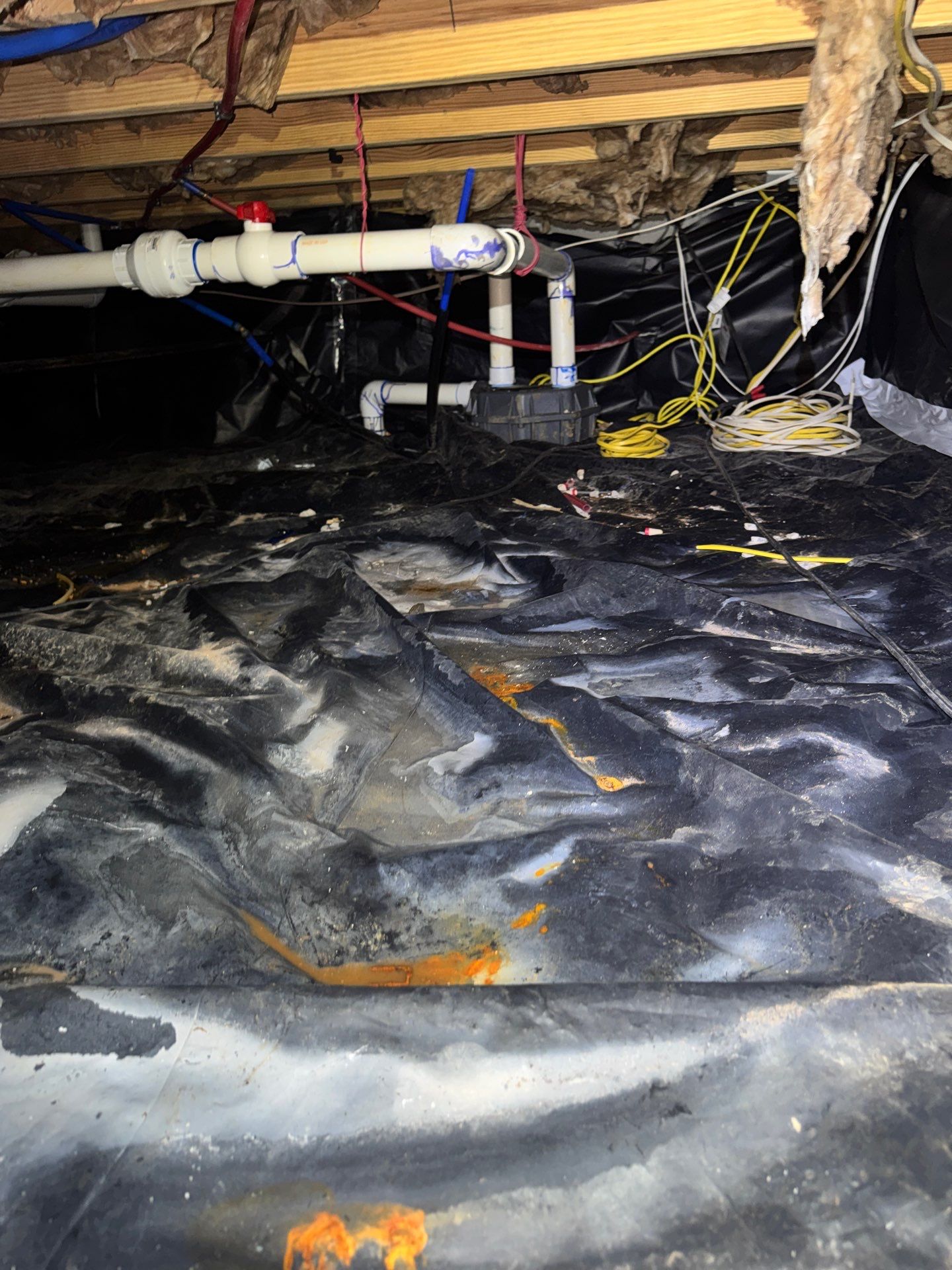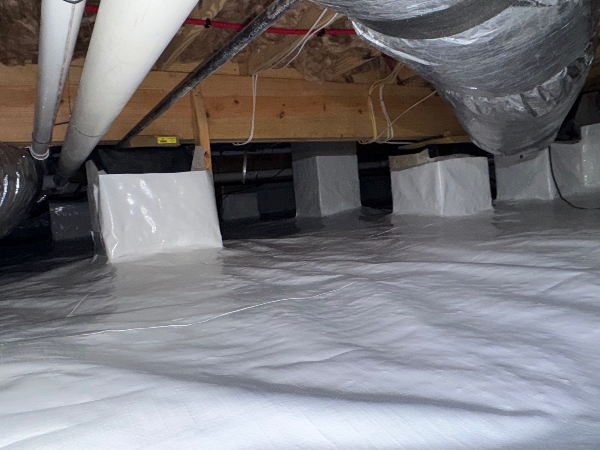 To restore the crawlspace, we began by removing the damaged vapor barrier, which showed signs of wear including holes, sagging sections, and water contamination. We also cleared out all compromised and contaminated debris to create a clean, stable foundation for repairs. From there, we installed a high-quality encapsulation system designed to properly seal and protect the crawlspace environment.
